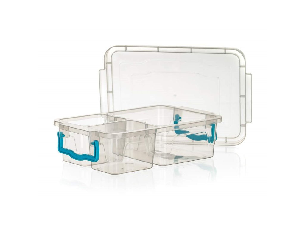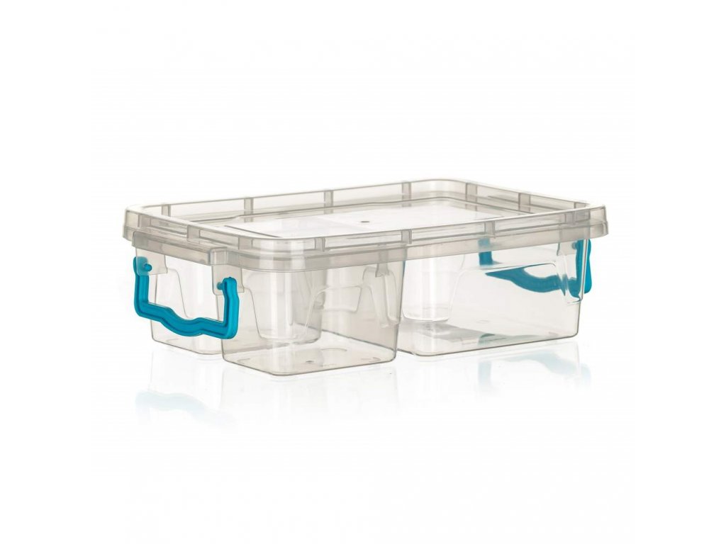 Dělený box GEMA s tyrkysovými madly má široké využití nejen v kuchyni, díky třem přihrádkám a transparentnímu provedení je velmi přehledný. Použití v mrazničce do -25 st.C a v mikrovlnné troubě do + 95 st.C. Objem přihrádek je 2 x 330 a 970 ml.Doplňkové parametry