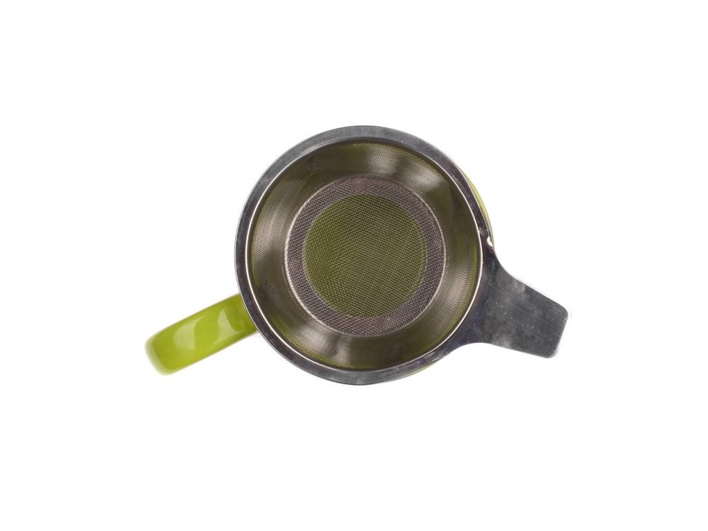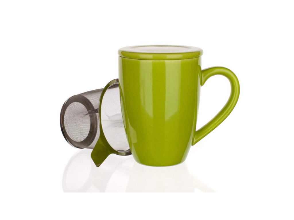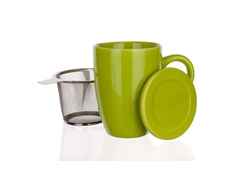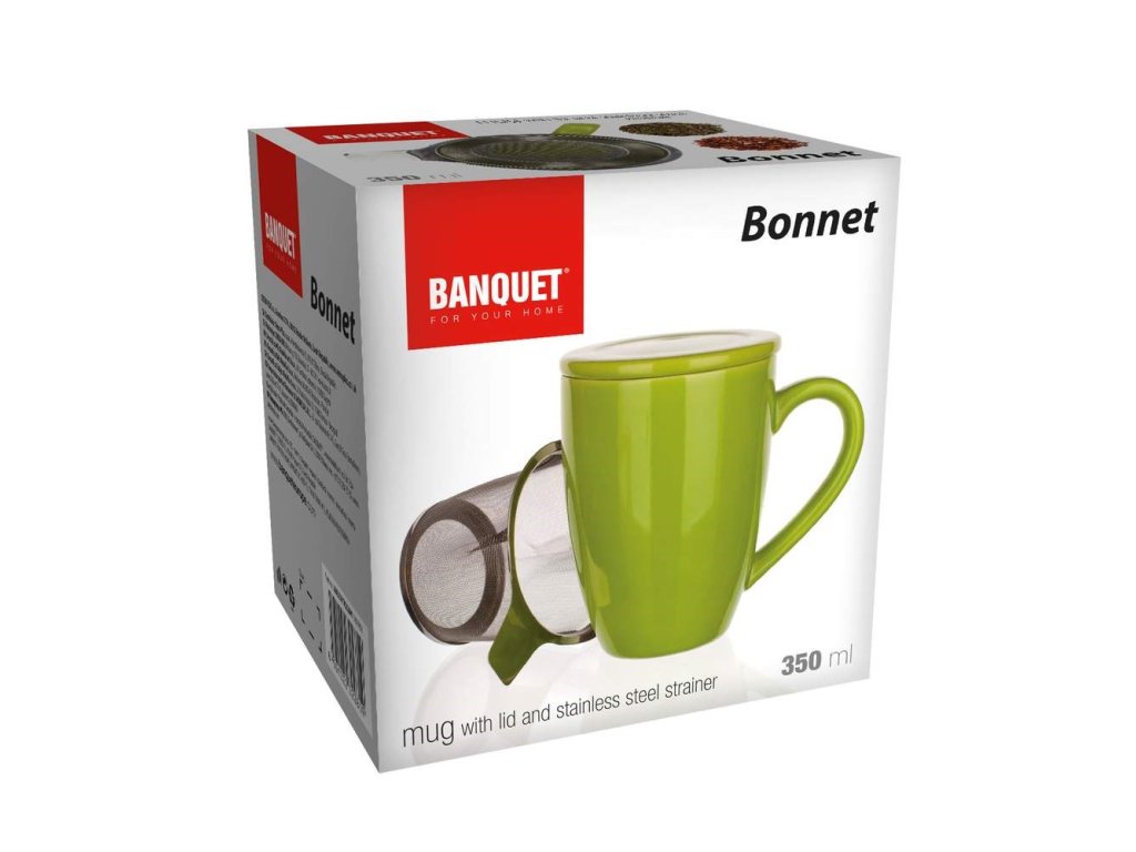 Hrnek s víčkem 350 ml BONNET, zelená glazura, materiál - keramika, nerezové sítko na louhování čaje. Rozměry hrnku: výška 12 cm, průměr 8,5 cm. Hrnek i víčko lze používat do mikrovlnné trouby a mýt v myčce na nádobí.- Barva: Zelená