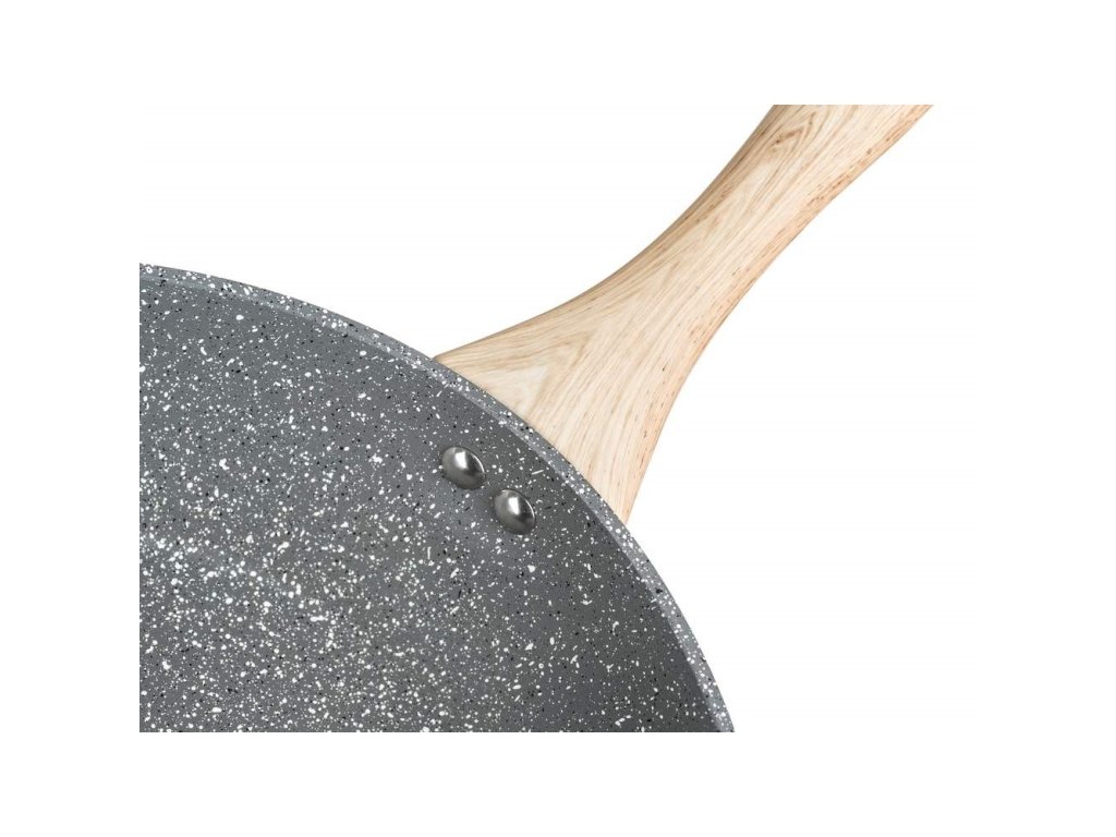Hliníková litá kovaná pánev NATURAL STONE 24 x 4,7 cm s nepřilnavým povrchem, kamenný vzhled, tloušťka stěny 3 mm, plně indukční dno s potiskem, rukojeť s imitací dřeva. Nepřilnavý povrch je velmi tvrdý a odolný proti poškrábání. Pánev je odolná proti nárazu- Barva: Šedá