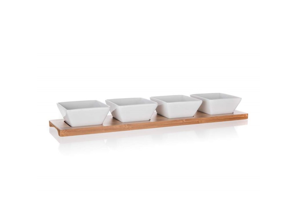 Sada 5 ks servírovacích keramických misek Brillante Bamboo na bambusovém prkénku o rozměru 40 x 9,5 cm, je praktická sada pochutinových misek o velikosti misky 8 x 8 x 4 cm.Doplňkové parametry