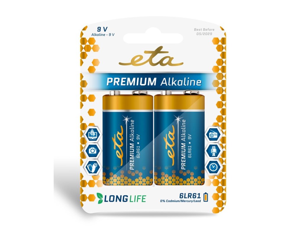 Prémiová alkalická baterie ETA 6LR61 – 9V, 2 ks v balení