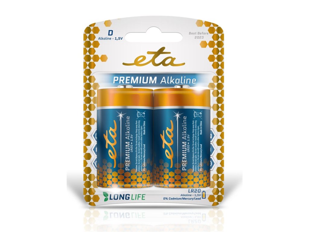 Prémiová alkalická baterie ETA D – LR20, 1,5V, blister 2 ks