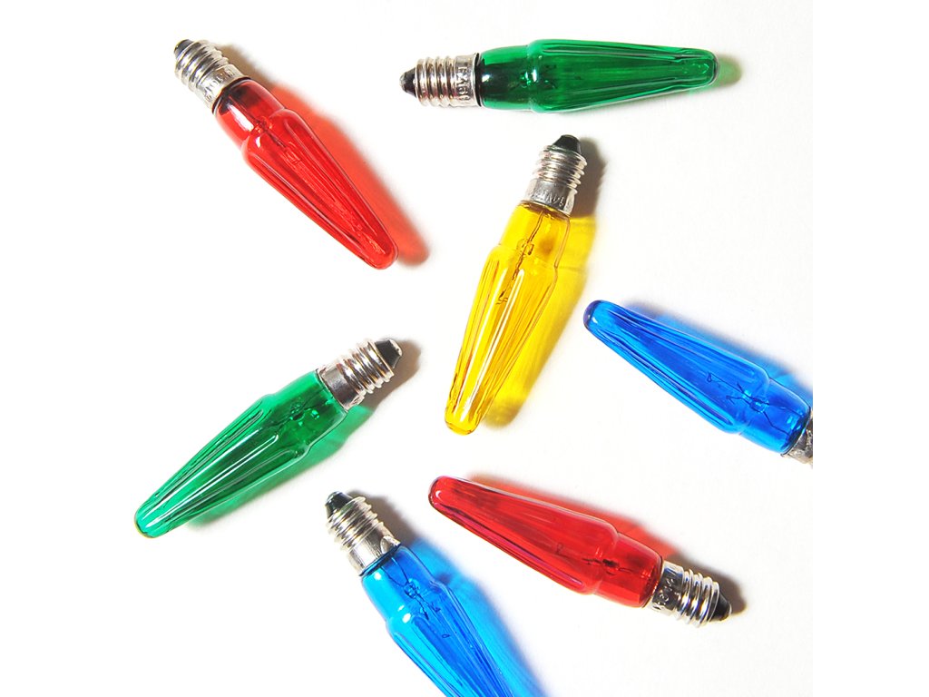 Tradiční skleněná žárovka ruční výroby1 blistr = 4 žárovky, mix všech barev (modrá, červená, zelená, žlutá)