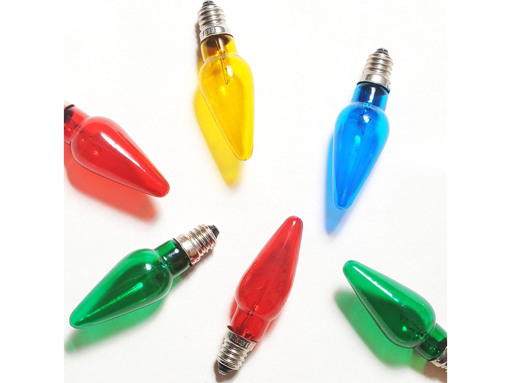 Tradiční skleněná žárovka ruční výroby1 blistr = 4 žárovky, mix všech barev (modrá, červená, zelená, žlutá)