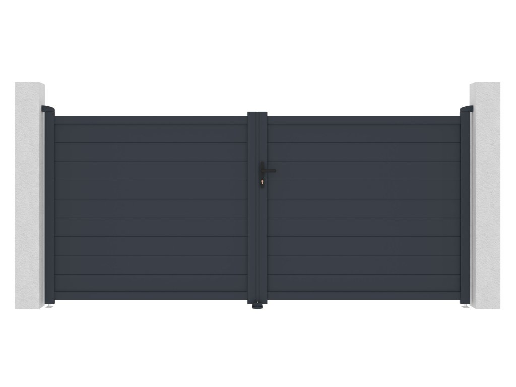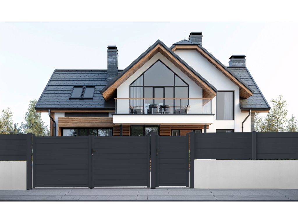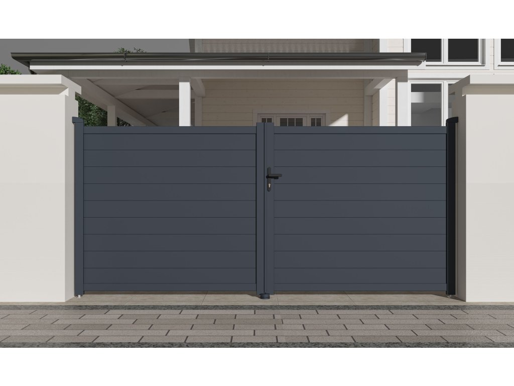 Výplň s horizontálně uloženými lamelami v atraktivním grafitovém provedení kombinuje dostatek soukromí s moderním designem, takže brána s otevíráním dovnitř bude slušet každému typu oplocené stavby.