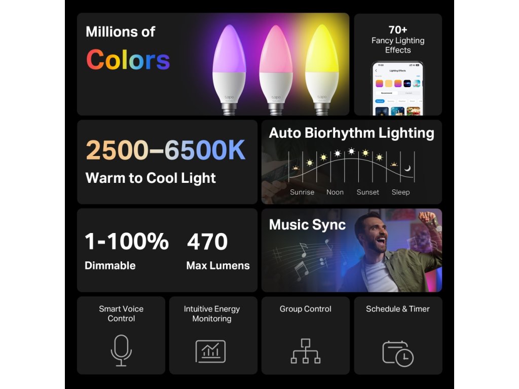 Světlo z žárovky můžete ztlumit nebo rozjasnit. U bílého světla si přizpůsobíte teplotu barvy od 2 500 do 6 500 kelvinů. Záleží, jaká vám v danou chvíli vyhovuje nejvíce. Kromě toho si u ní přizpůsobíte jas v rozmezí od 1 % do 100 %. Jistě také oceníte výběr z mnoha světelných efektů v aplikaci Tapo pro navození správné atmosféry nebo dokonce synchronizaci světel s hudbou.