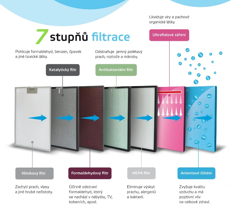 7 stupňová filtrace odstraní až 99,9 % polétavého prachu velikosti PM 2,5 (částice menší než 2,5 mikrometru).