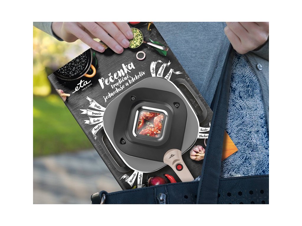 Pracovní nádoba Pečenky je z nepřilnavého povrchu (teflon) a výjimečný je její praktický čtvercový tvar. Ten oceníte zejména při pečení typických „Honzových“ buchet. Víko s nerezovou obrubou a speciálními ventilačními otvory disponuje praktickým skleněným průzorem. Bezpečné používání zajišťuje také pojistka automatického vypnutí při odejmutí víka. Podstavec je stabilní a tepelně odizolovaná držadla umožňují bezpečnou obsluhu a manipulaci. Praktičnost doplňuje také délka přívodního kabelu 1,5 m. Moderní design Pečenky ETA padne do moderní kuchyně i na chalupu.