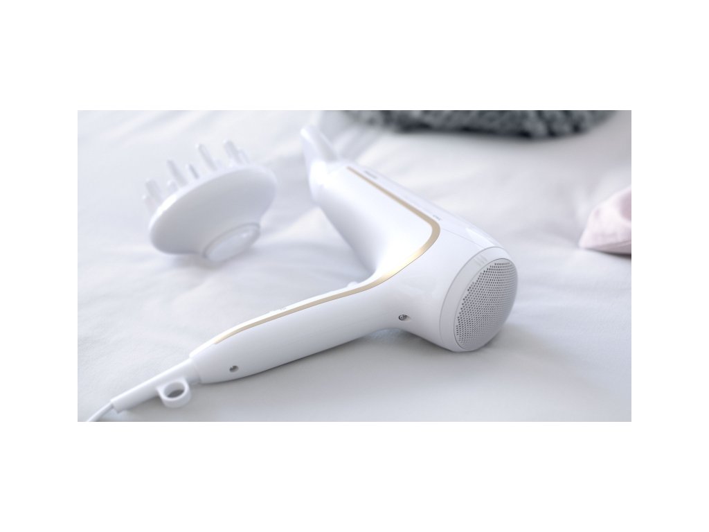 Tento vysoušeč má několik nastavení rychlosti a teploty. K dispozici je funkce ThermoProtect pro rychlé vysoušení při stálé šetrné teplotě a ionizační péče pro lesklé vlasy bez třepení.