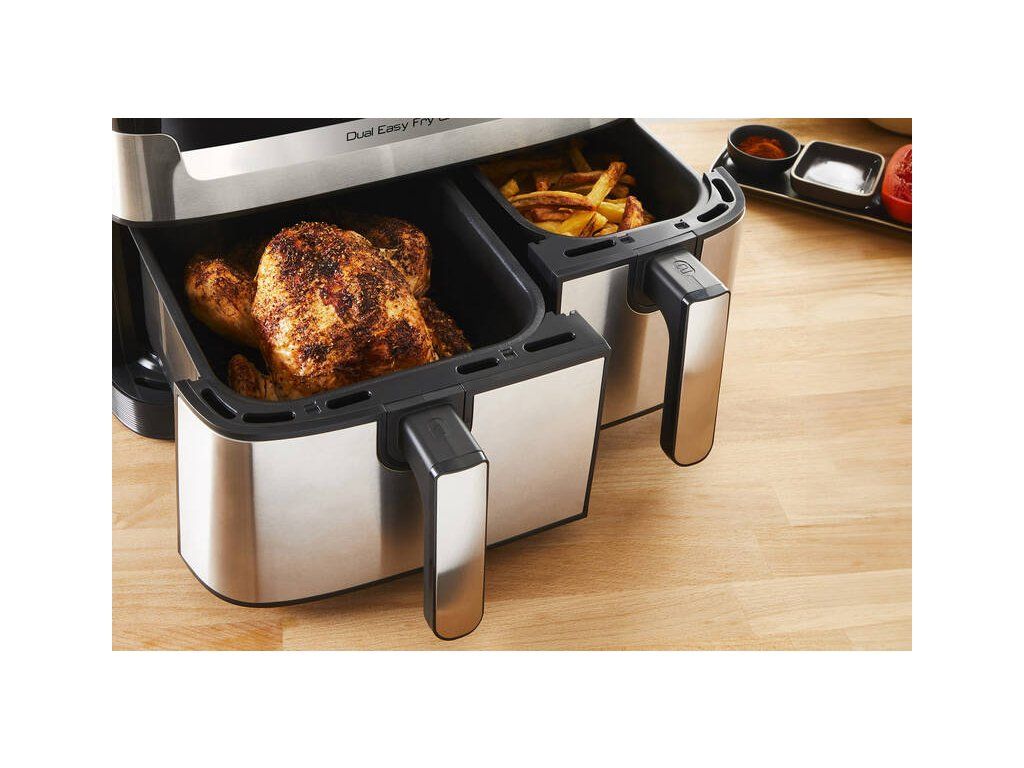horkovzdušná fritéza • příkon 2 700 W • XXL objem hlavního fritovacího koše 5,2 l • menší fritovací koš s objemem 3,1 l • digitální displej • 8 přednastavených programů • regulace teploty • mobilní aplikace pro více receptů • technologie Extra-Crisp pro křupavé pokrmy bez tuku • nepřilnavý povrch • časovač • světelná signalizace • grilovací mřížka • V × Š × H: 30,5 × 40,2 × 41,8 cm