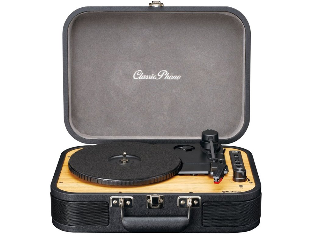 Vychutnejte si poslech své oblíbené hudby se stylovým přehrávačem gramodesek CLASSIC PHONO TT-116BK. Tento praktický retro kufříkový gramofon nepřehrává pouze vaše vinylové desky. Umožňuje vám streamování vaší oblíbené skladby do vestavěných reproduktorů pomocí telefonu nebo tabletu. Přehrávanou hudbu je navíc možné nahrávat přímo na USB.
