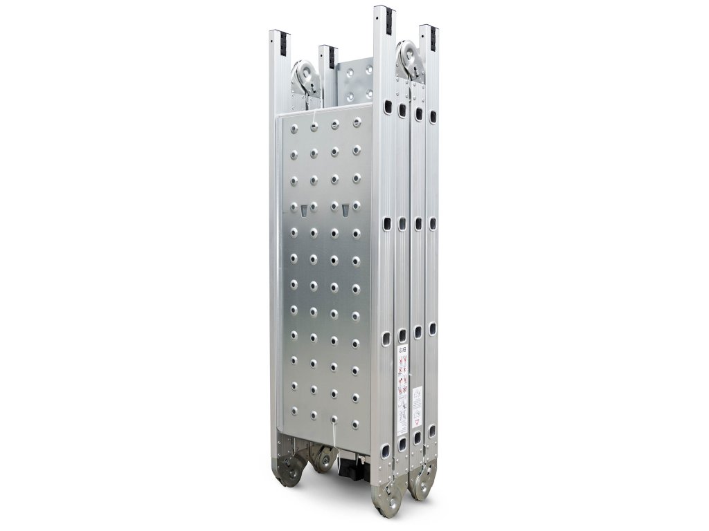 Hliníkové štafle můžete využít jednak jako dlouhý žebřík v délce až 4,6 m. Další variantou je možnost sestavit štafle jako přenosné lešení. Balení obsahuje 2 ks podlážek pro přestavbu štaflí na lešení. Díky konstrukci s klouby lze štafle snadno umístit přes hřeben střechy.