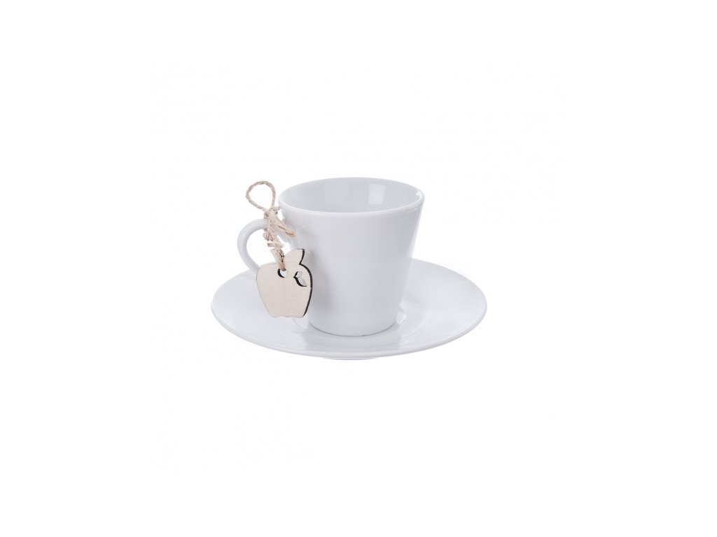 Hrnek s uchem, podšálek a přívěsek. Materiál: porcelán, dřevo. Barva bílá. Rozměry: objem 0,09 l, pr. š. 6 cm, pr. podš. 12 cm, přívěsek 2,5x2,5 cm.Doplňkové parametry