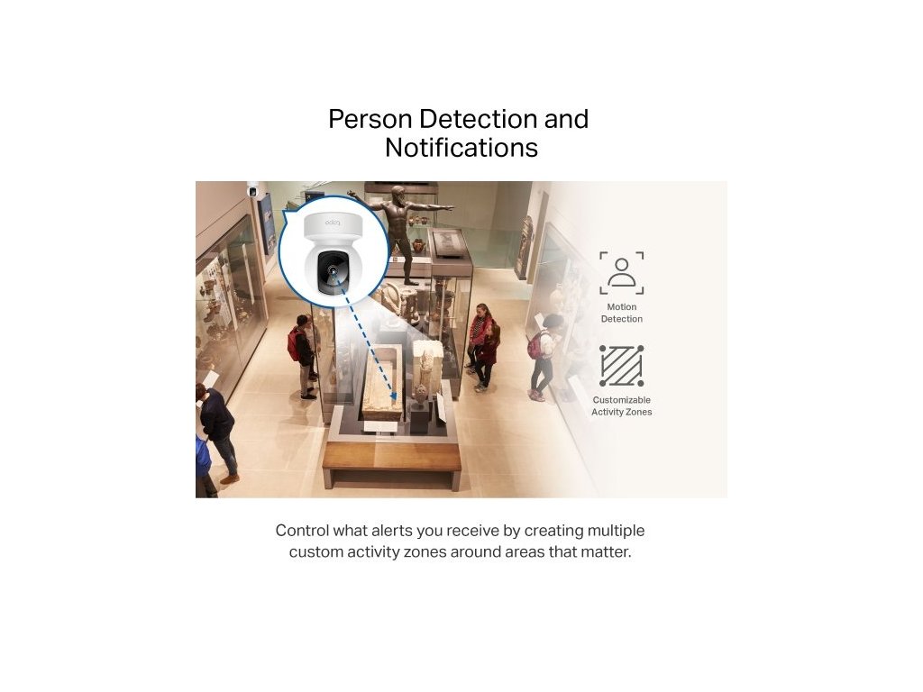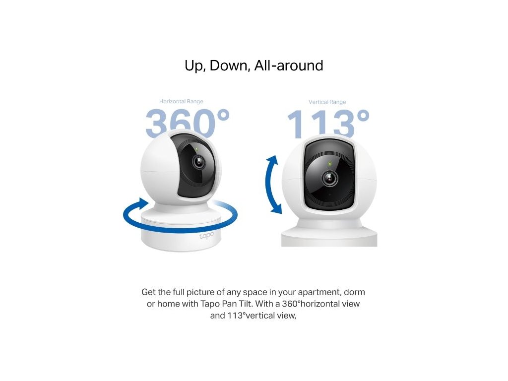 Video kamera nahrává z různých úhlů. Zvládá totiž 360° horizontální a 113° vertikální rotaci. Chcete zamezit kameře v nahrávání? Nemusíte ji fyzicky otáčet, stačí aktivovat režim soukromí. Vyberete v něm oblast, kterou kamera nebude natáčet. Záznamy se ukládají na SD kartu. Tím zabráníte případným hackerským útokům přes internet. Využít ovšem můžete i cloud Tapo Care.
