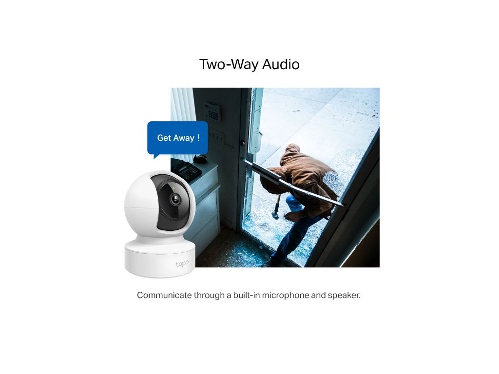 Komunikujte s milovanou osobou pomocí integrovaného mikrofonu a reproduktoru. Pokud se na váš pozemek dostane nezvaný host, můžete ho odehnat a oznámit mu, že o něm víte. Kameru připojíte přes ethernetový port nebo Wi-Fi síť. Získané záznamy snadno sdílíte se svou rodinou nebo hosty prostřednictvím služby Tapo.