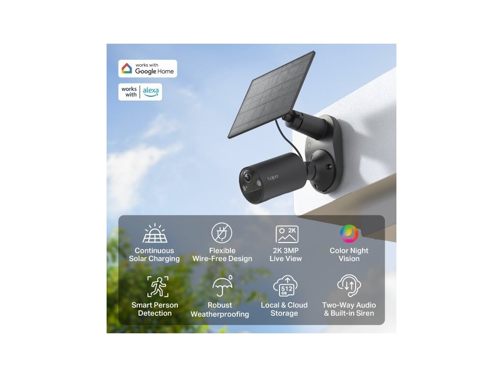 Bezpečnostní kamera se solárním panelem TP-Link Tapo C411 je ideální pro venkovní zabezpečení vaší domácnosti či firmy. Připojíte ji bezdrátově, takže ji můžete umístit kamkoliv – do interiéru, na dvůr nebo klidně na zahradu. O nabíjení se postará solární panel Tapo. Kamera je vybavená krytím IP65, takže odolá povětrnostním vlivům. Neublíží jí tedy ani déšť a ani prach. Bez obav vydrží teploty od -20 do +45 °C.