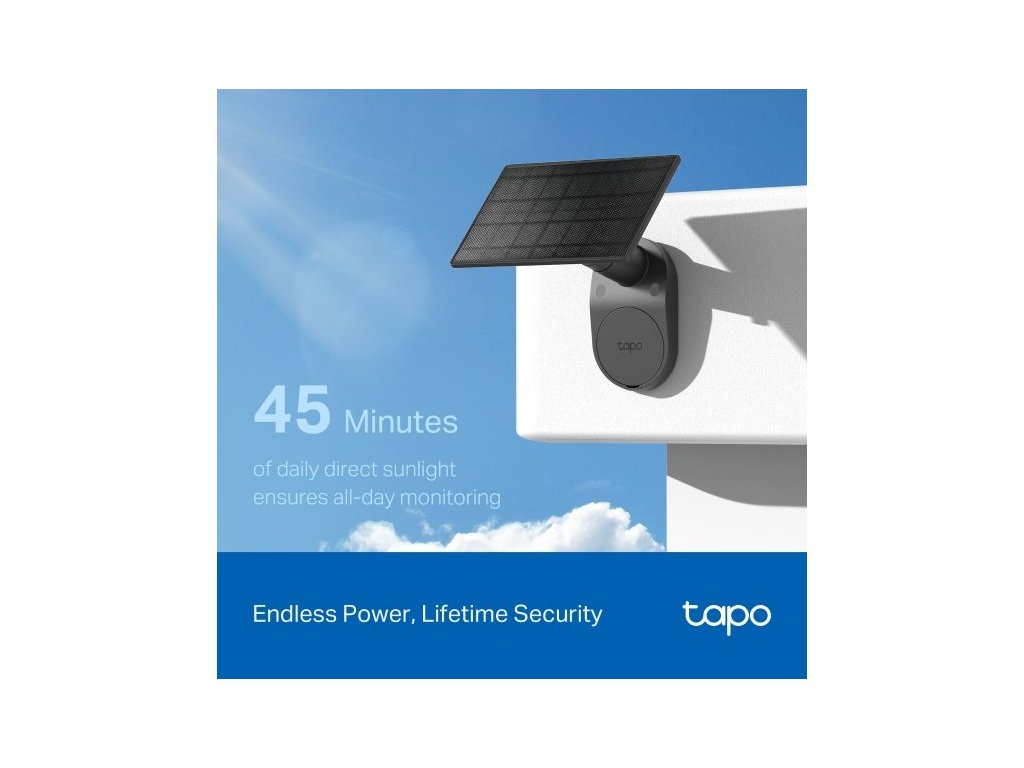 Baterie má velmi nízkou spotřebu a vydrží až 180 dní provozu na jedno nabití. Snadno ji dobijete. Také můžete využít solární panel Tapo A201 (součástí balení), abyste si zajistili nepřetržitý chod. Pouhých 45 minut přímého slunečního záření zajistí celodenní fungování kamery. Nemusíte se tak obávat ani výpadků proudu během letních bouřek.