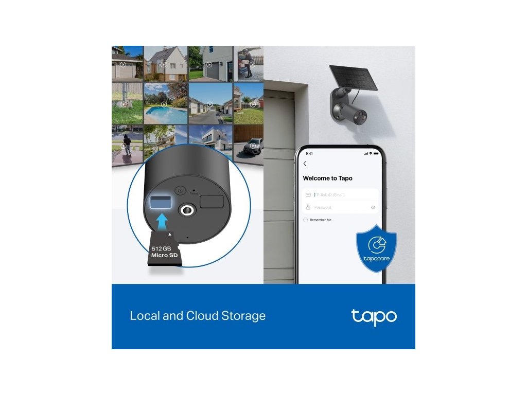 Pořízené záznamy ukládáte na kartu microSD o kapacitě až 512 GB. Další možností je ukládání dat na cloudové úložiště Tapo Care, které poskytne neomezený prostor pro vaše bezpečnostní záznamy.