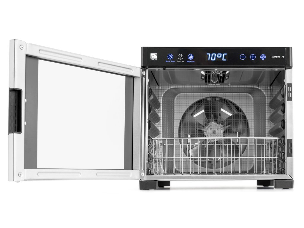 Vnitřní nerezový koš vám umožní využití sušičky na maximum. Do koše můžete vkládat předměty na dezinfekci UV světlem, využijete jej i pro uložení skleniček při přípravě domácího jogurtu v sušičce potravin, sušení pečiva na strouhanku a podobně.
