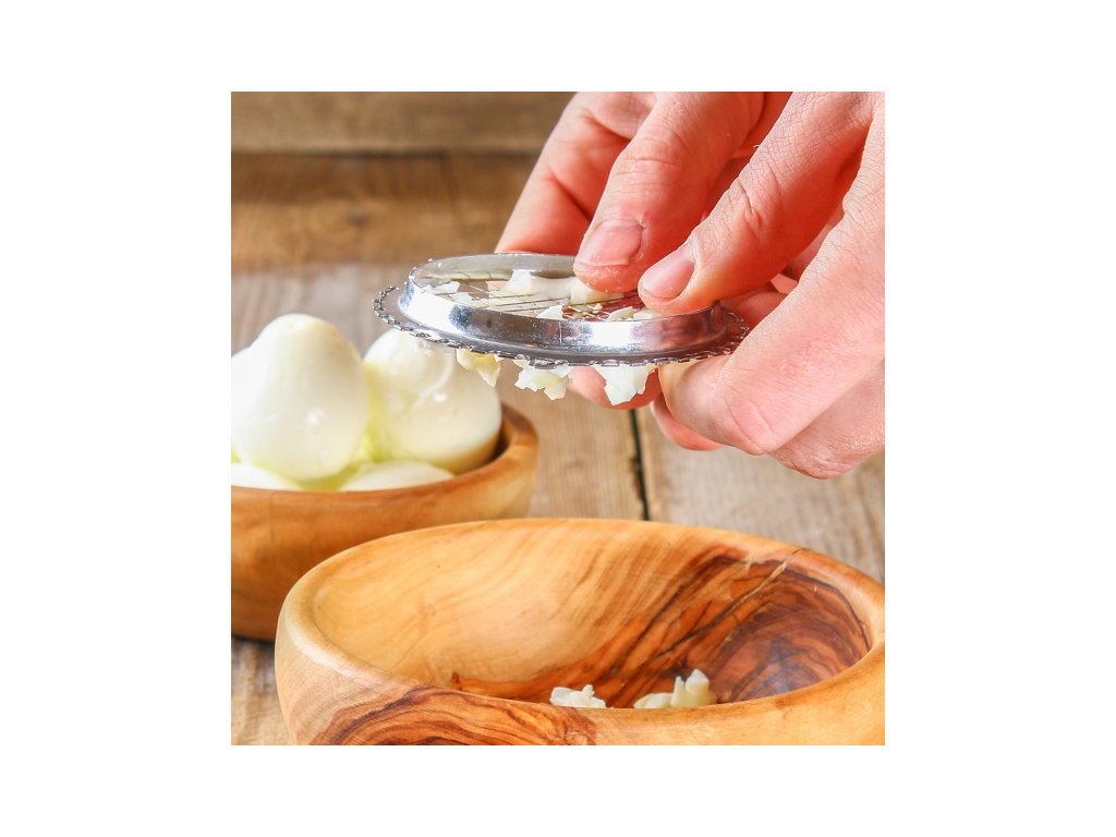 Kráječ vařených brambor i jiné zeleniny - pomocník pro přípravu bramborového salátu. Materiál: nerez. Rozměry: pr. 9 cm, v. 1 cm. Velikost otvorů pro krájení cca 7x7 mm.