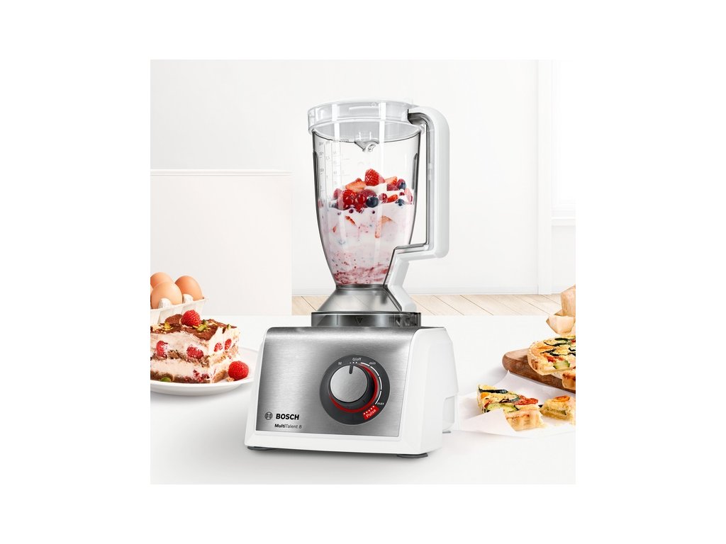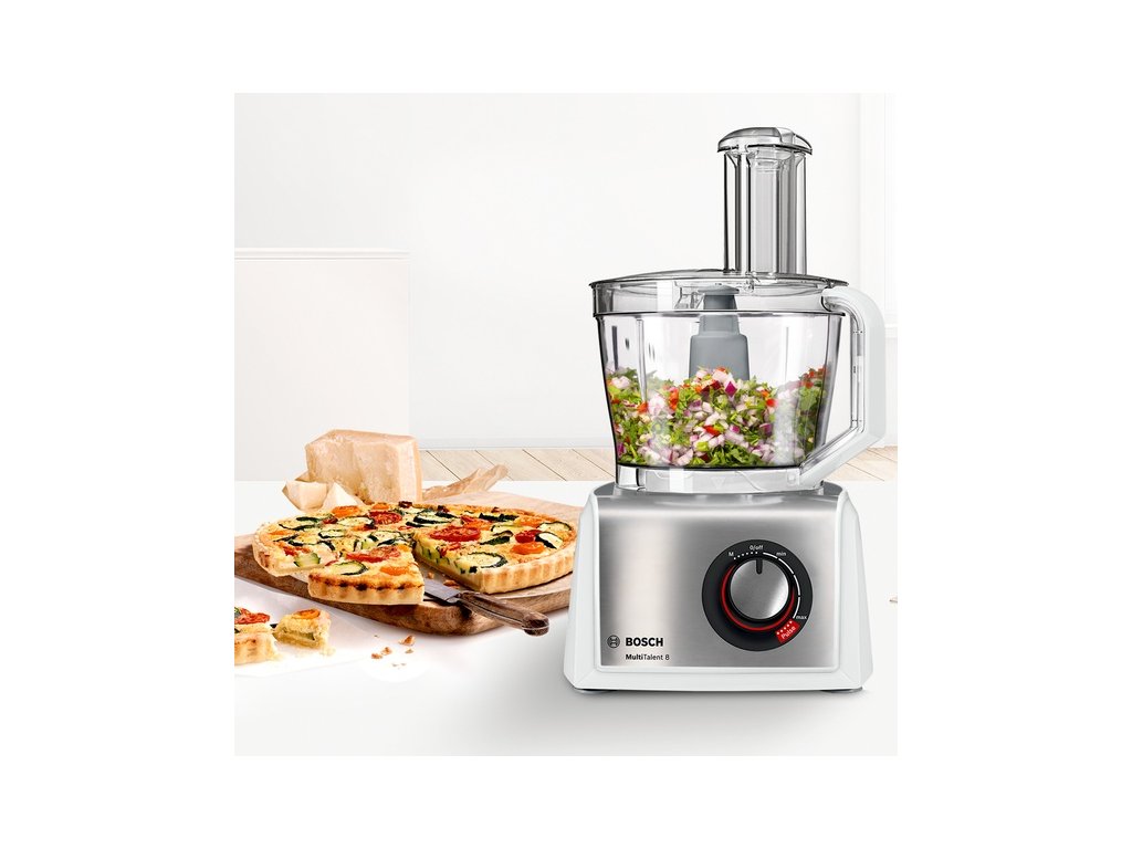 1250 W, mísa 3,9 l, plast. hnět. hák, universální nůž, mích./šleh. metla, mixér 1,5 l, oboustranný krouhací a krájecí kotouč, kotouč na hranolky, pěchovadlo.