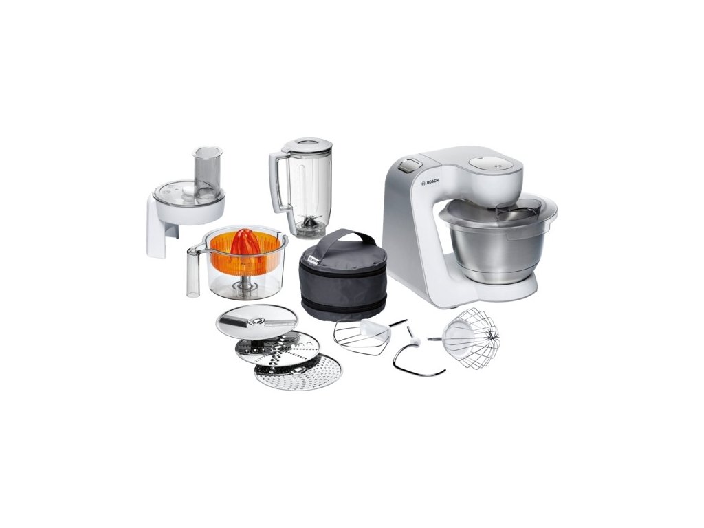 900 W, 7 rychlostí + moment. stupeň, nerez mísa 3,9 l, hnětací hák, šlehací metla, míchací metla, průběhový krouhač, plastový mixér 1,25 l, lis na citrusy, bílá/stříbrná