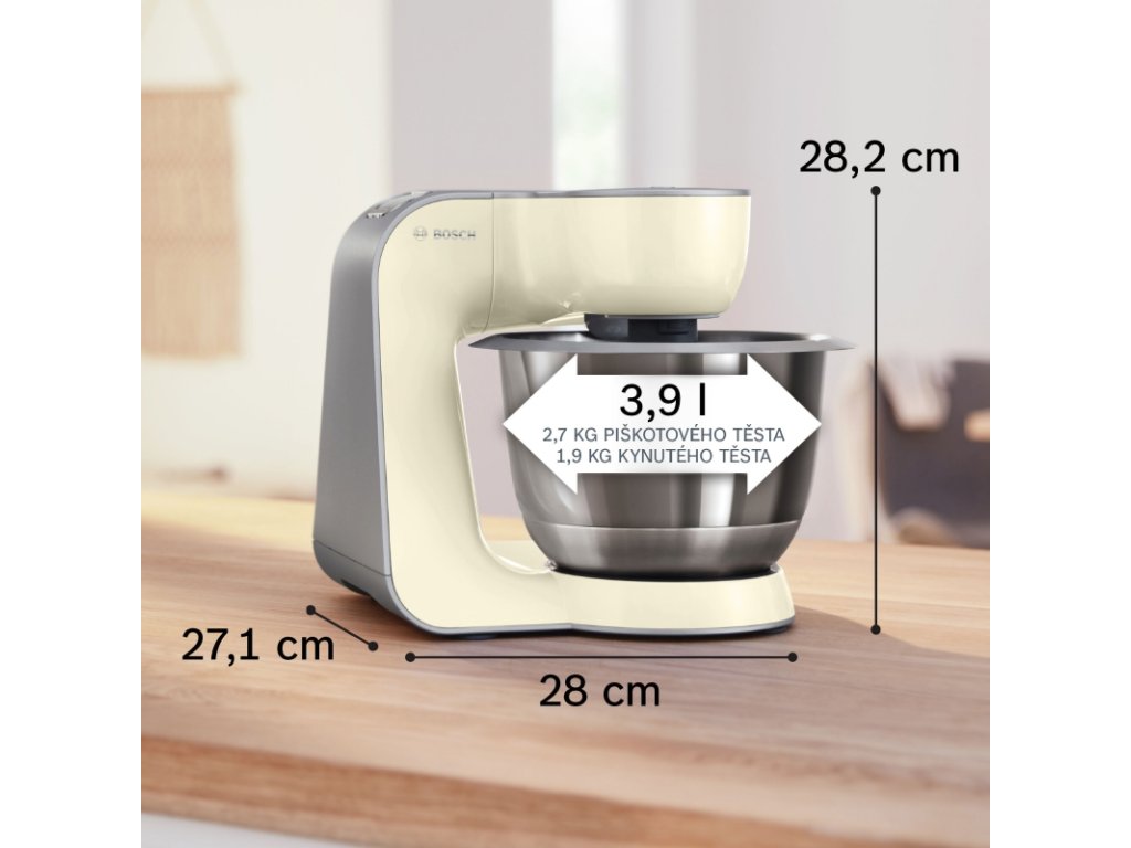 - Objemná mísa (3,9 litru) a 3D planetární míchání umožní perfektní promísení až 2,7 kg piškotového těsta nebo 1,9 kg kynutého těsta.