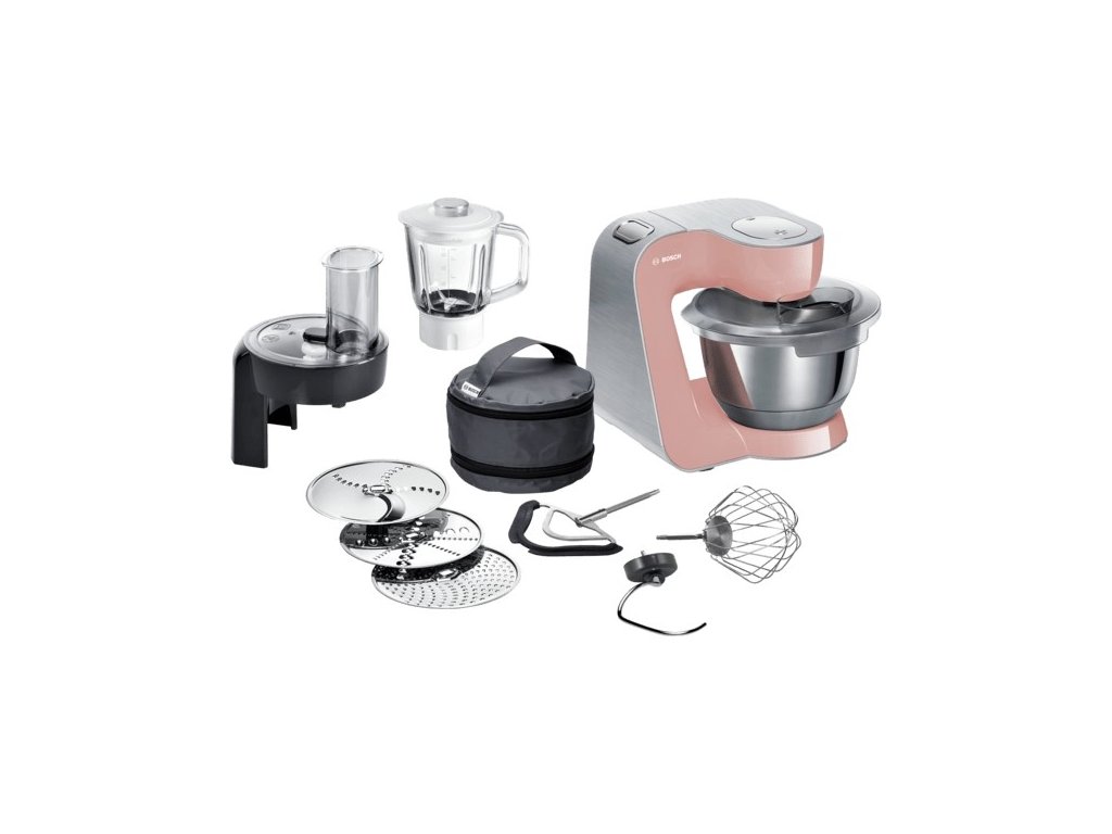1000 W, 7 rychlostí + moment. stupeň, nerez mísa 3,9 l, míchací metla, hnětací hák, šlehací metla, průběhový krouhač, skleněný mixér.