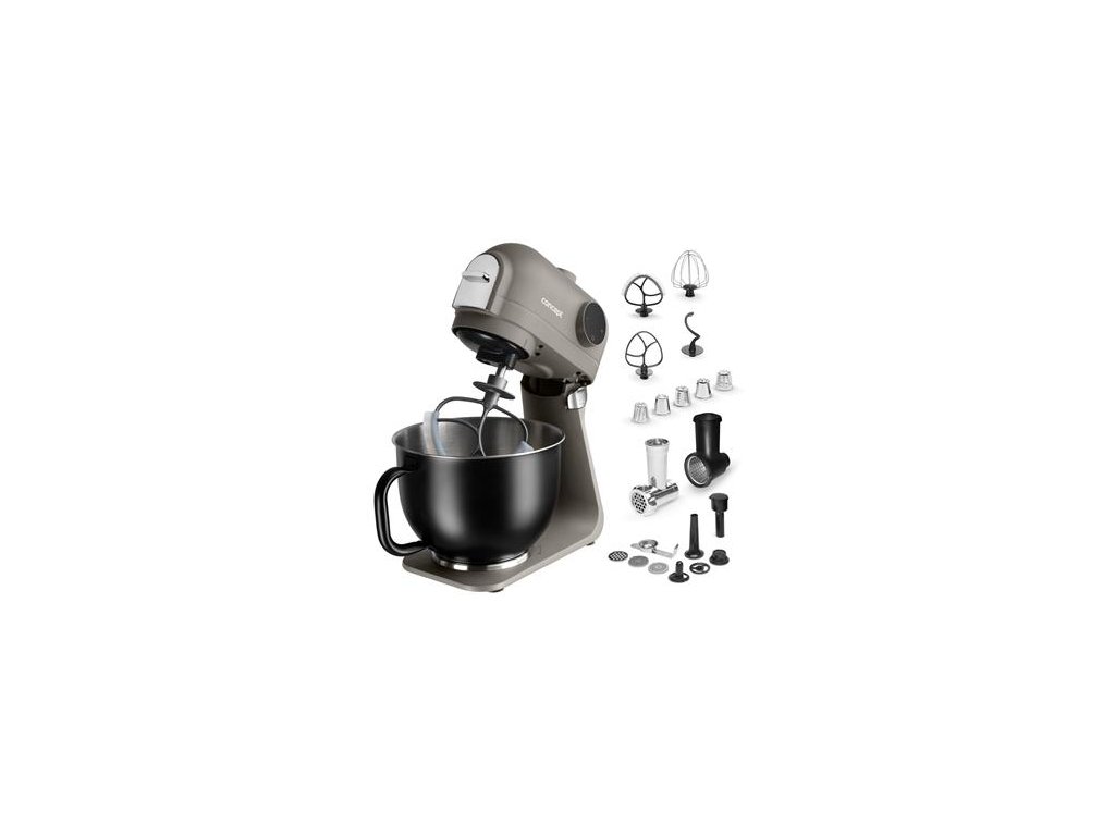 Robot je opatřen čtyřmi druhy celokovových metel. Míchací metla je vhodná na třená a jiná středně těžká těsta. Flexi metlu oceníte při přípravě lehkých krémů, náplní a polev. Díky gumové stěrce dokonale kopíruje mísu a perfektně stírá směs ze stěn. Šlehací metla je ideální na šlehání vajec, bílků, šlehačky, lehkých krémů, majonézy i omáček. Hnětací hák si skvěle poradí se zpracováním kynutých těst, např. na buchty, chleba nebo pizzu. Součástí robota je i 5 litrová nerezová mísa s praktickým držadlem a víkem.