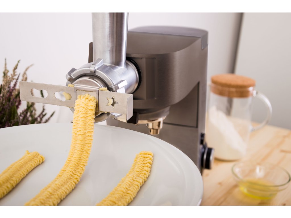 Na mlýnek můžete připevnit také disky na těstoviny. Snadno a rychle tak vykouzlíte výtečné italské penne, domácí široké nudle nebo tolik oblíbené špagety. Aby se při výrobě těstoviny neslepily, jsou disky přizpůsobeny speciálními výběžky.
