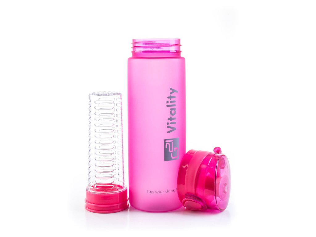 Růžová láhev G21 na smoothie/juice v mrazivém designu je vyrobena z odolného a nezávadného tritanu. Má objem 600 ml a je to praktický parťák nejen na doma, ale i do přírody nebo na sport. Navíc obsahuje plastové vkládací sítko na louhování bylinek, kousků ovoce nebo čajů.