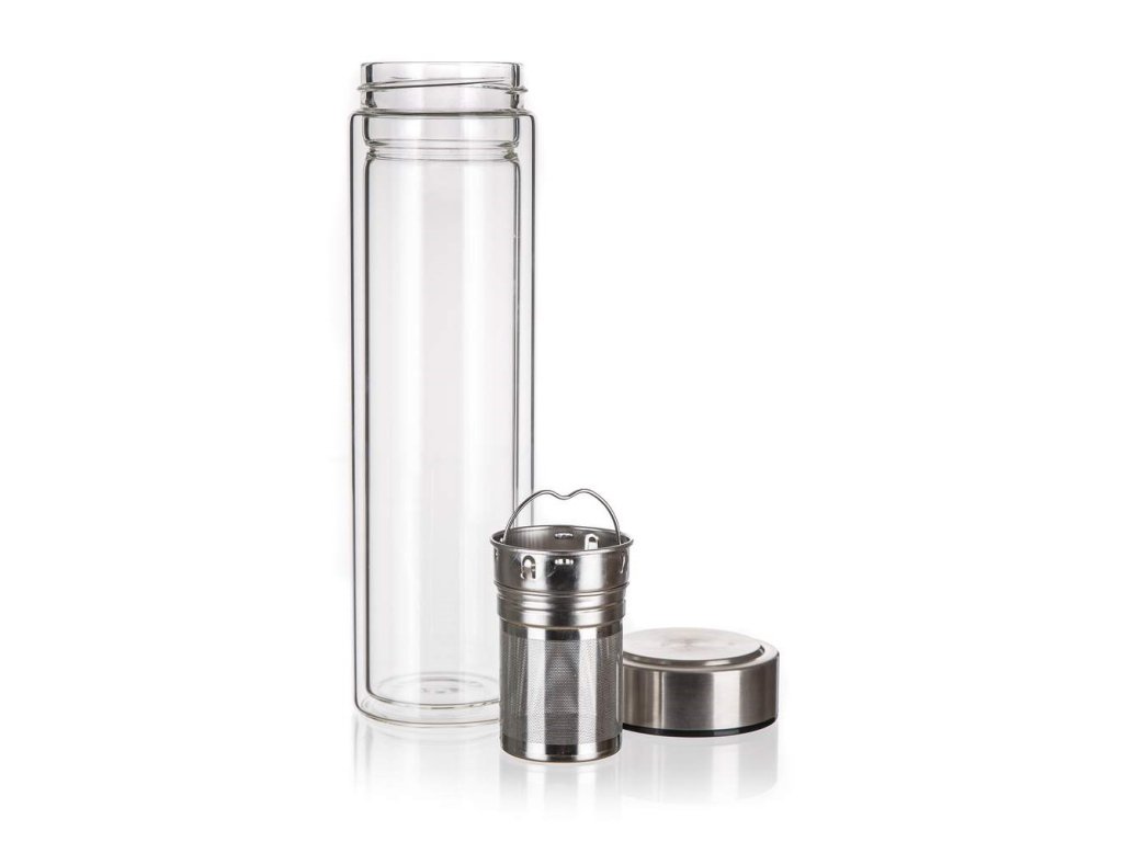 Láhev se sítkem DOBLO 500 ml je vyrobena z borosilikátového skla, které je odolné proti vysokým teplotám. Díky dvoustěnnému provedení nepřenáší teplotu nápoje na povrch láhve a nápoj vydrží déle teplý nebo studený. Láhev obsahuje odnímatelné sítko z nerezové oceli, díky kterému si můžete vychutnat sypaný čaj či vodu s ovocnou příchutí. Láhev se uzavírá víčkem z nerezové oceli 18/8.Doplňkové parametry