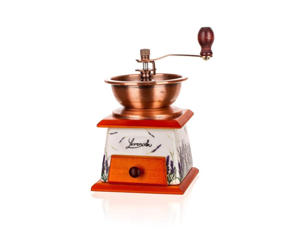 Ruční mlýnek na kávu s keramickým mechanismem, dekorované keramické tělo s dřevěnými doplňky a kovovou násypkou, keramickou mlecí mechaniku lze nastavit na požadovanou hrubost mletí.- Délka (cm): 11,5