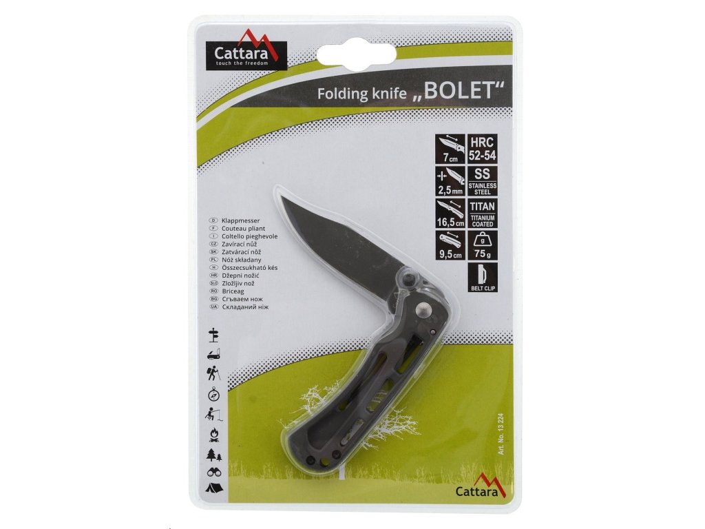 Skládací 16,5cm kapesní nůž Cattara Bolet je nezbytnou součástí výbavy pro camping, rybaření a většinu outdoorových aktivit. Čepel nože je zhotovena z nožířské oceli 420J2, délky 7 cm o síle 2,5 mm. Tato slitina chromu, niklu, manganu, křemíku, fosforu, uhlíku, síry a železa dosahuje vynikající tvrdosti HRC52-54 a je obzvláště vhodná do nepříznivého prostředí, kde exceluje svou odolností vůči korozi a vnějším vlivům.