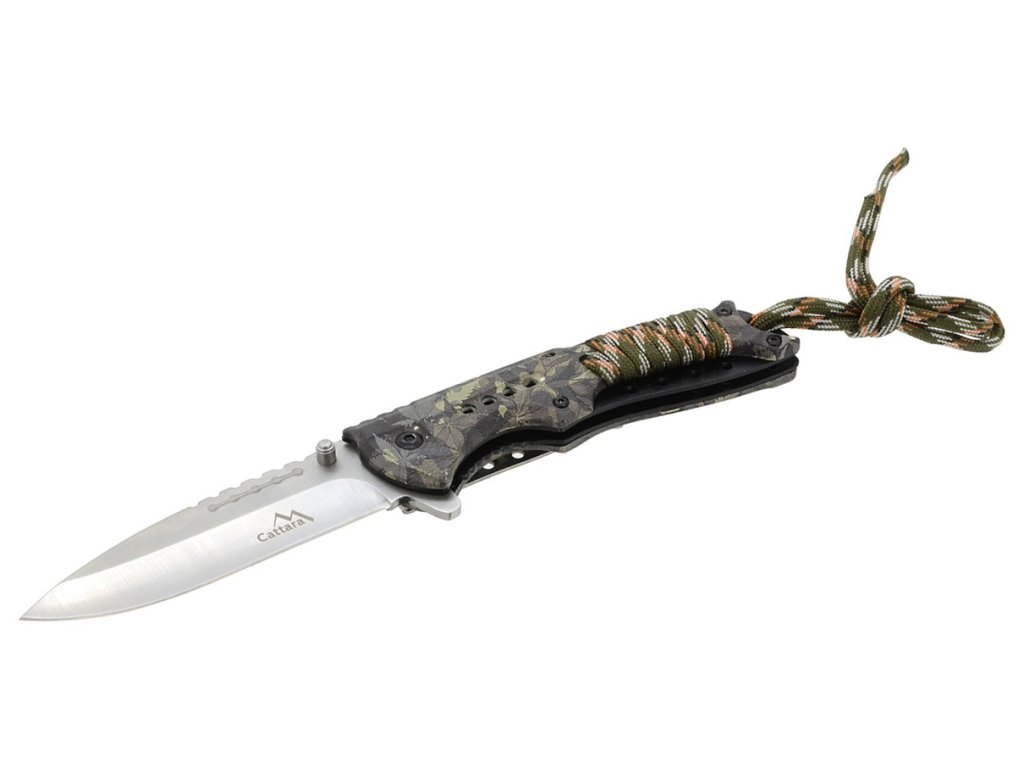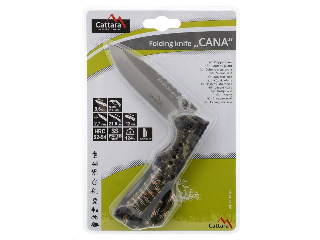 Skládací 21,6cm kapesní nůž Cattara Cana je nezbytnou součástí výbavy pro camping, rybaření a většinu outdoorových aktivit. Čepel nože je zhotovena z nožířské oceli 420J2, délky 9,6 cm o síle 2,7 mm. Tato slitina chromu, niklu, manganu, křemíku, fosforu, uhlíku, síry a železa dosahuje vynikající tvrdosti HRC52-54 a je obzvláště vhodná do nepříznivého prostředí, kde exceluje svou odolností vůči korozi a vnějším vlivům.
