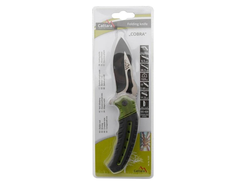 Skládací 20,5cm kapesní nůž Cattara COBRA je nezbytnou součástí výbavy pro camping, rybaření a většinu outdoorových aktivit. Čepel nože je zhotovena z nožířské oceli 420J2, délky 9,6 cm o síle 2,65 mm. Tato slitina chromu, niklu, manganu, křemíku, fosforu, uhlíku, síry a železa dosahuje vynikající tvrdosti HRC52-54 a je obzvláště vhodná do nepříznivého prostředí, kde exceluje svou odolností vůči korozi a vnějším vlivům.