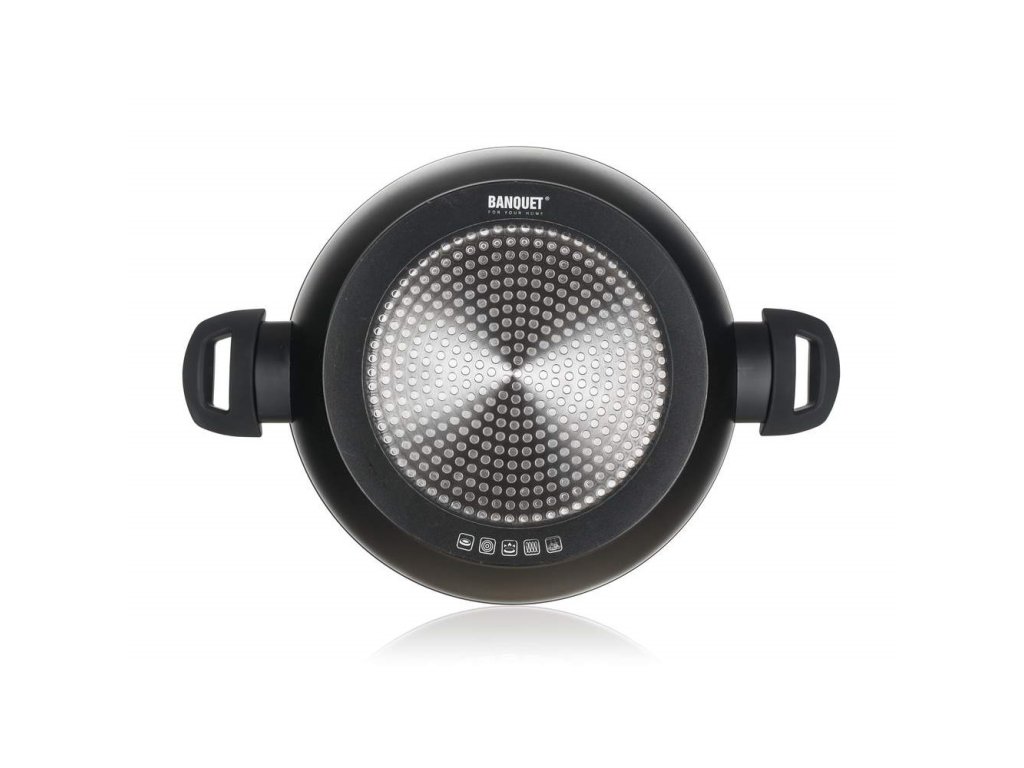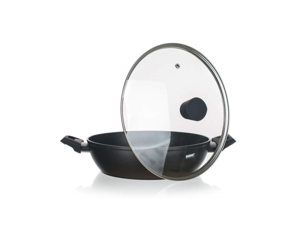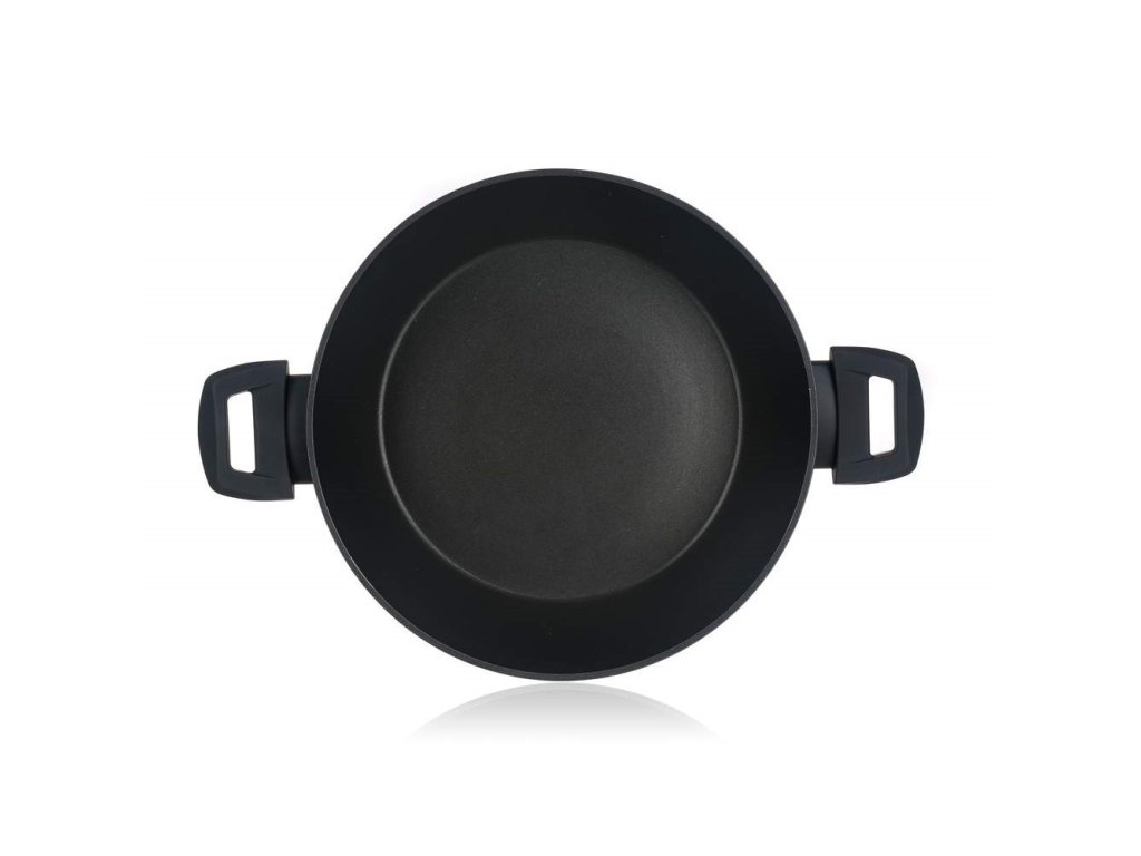 Hliníková kovaná pánev na paellu GRAZIA o rozměru 28 x 7,8 cm se skleněnou poklicí, se značkovým nepřílnavým 3vrstvým povrchem ILAG PREMIUM, s vnějším 2vrstvým žáruvzdorným nástřikem, barva černý mat, tl. stěny 3.0 mm, indukční dno s piktogramovým laserovým potiskem, knob a ucha se soft touch povrchovou úpravou.- Barva: Černá
