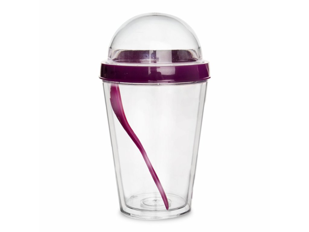 Pohár na jogurt s víčkem, zásobníkem na křupinky a lžičkou. Materiál: plast. Barevný assort. Rozměry: objem 0,33 l, zásobník na křupinky 0,11 l, pr. 9 cm, v. 15 cm.