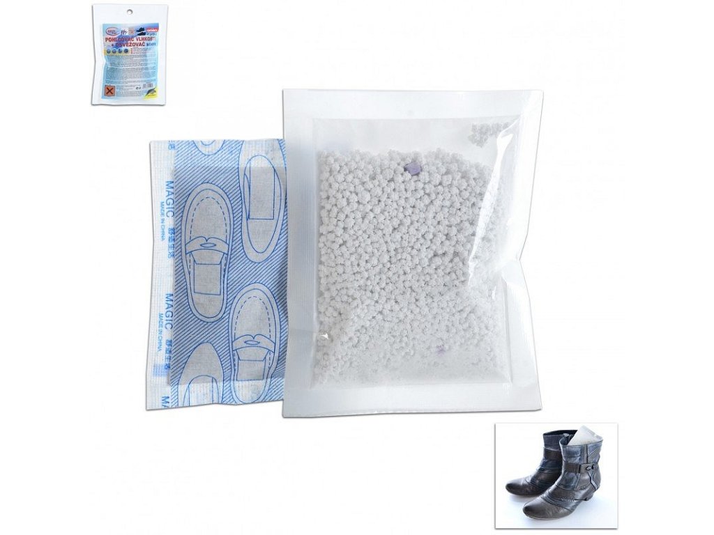 Pohlcovač vlhkosti + osvěžovač zamezuje srážení vlhkosti v rozích místnosti a oknech, vzniku plísní, saje vlhkost a je určen především do botníků, mokré obuvi,... Odvlhčovač nevydává zvuk, osvěžovač provoní vzduch po levandulích. Obsahuje granule na bázi chloridu vápenatého, který absourbuje vlhkost ze vzduchu. Rozměry: 41 g + 53 g, 9x12 cm, 7x10 cm.