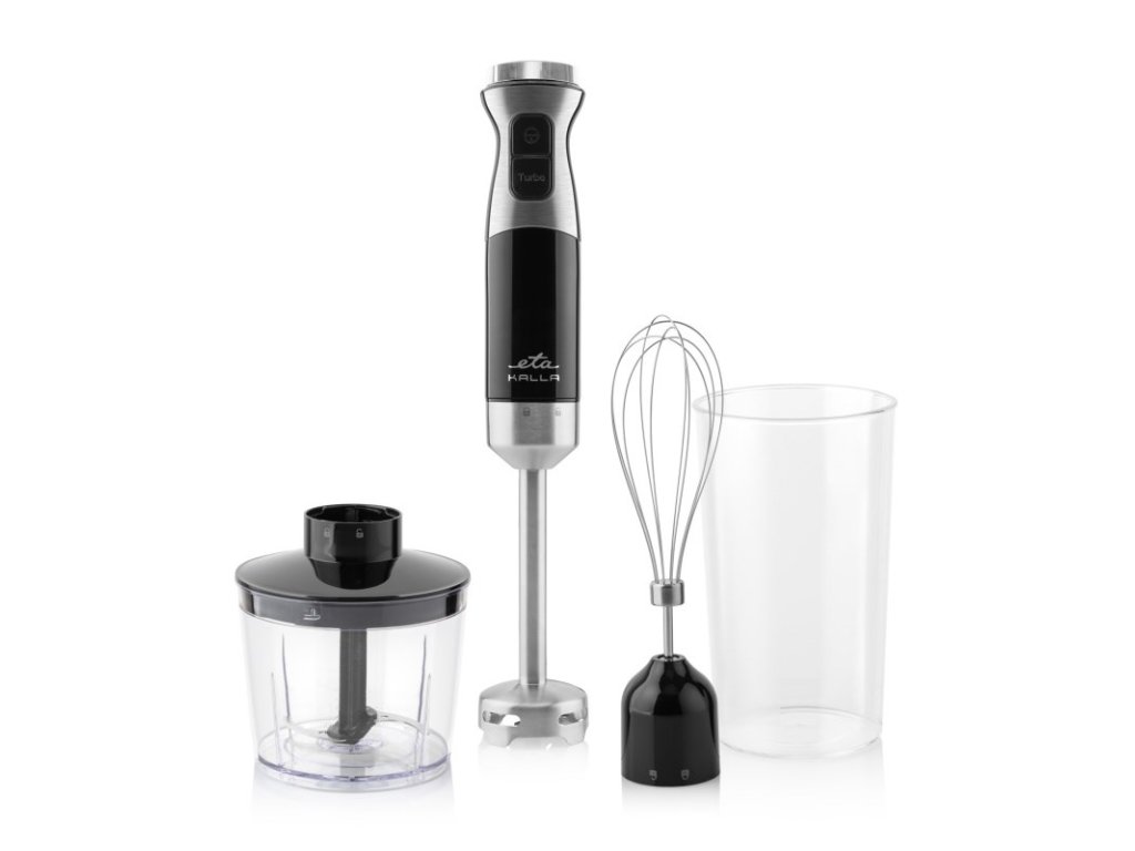 Ponorný mixér s příkonem 800 W a plynulou regulací otáček. Nerezový nástavec na mixování, šlehací nástavec a 700ml nádoba v balení