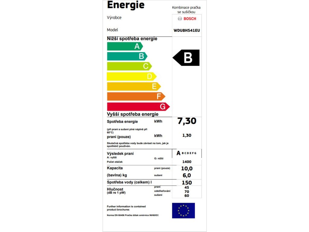 • energetický štítek: třída energetické účinnosti B v rozsahu tříd energetické účinnosti od A do G / třída účinnosti praní A