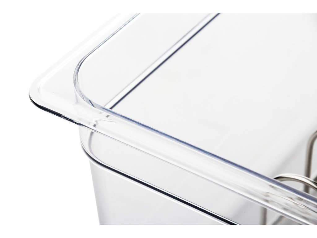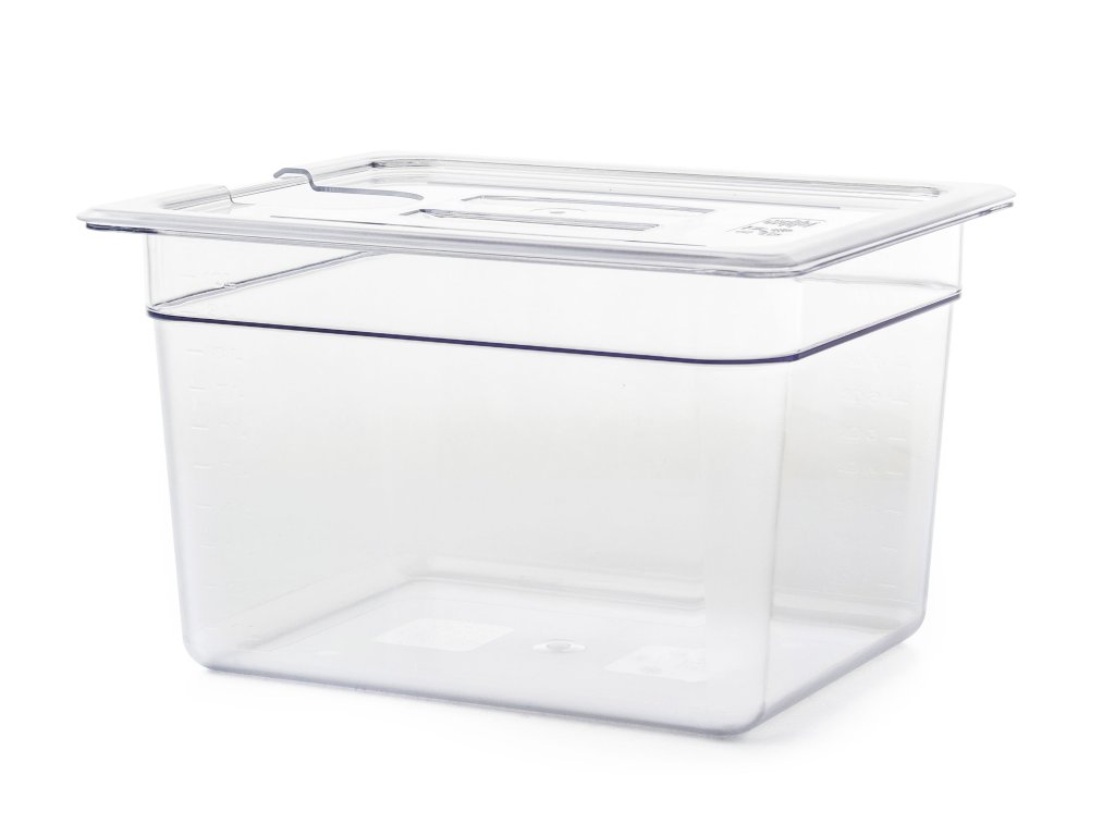 Nádoba G21 pro sous-vide vaření je vyrobena z vysoce odolného polykarbonátu a oproti kovovým hrncům efektivněji udržuje teplotu a zahřátí vodní lázně trvá kratší dobu. Polykarbonát splňuje nejpřísnější požadavky na bezpečnost a je zdravotně nezávadný. Díky vysoké stálosti použitého materiálu je možné nádobu mýt v myčce na nádobí, což vám ušetří mnoho času i námahy s úklidem. Dále je nádoba vybavená sundavací poklicí s výřezem na sous-vide vařič. Poklici však lze používat i s vařičem jiné značky, neboť se do otvoru vejde většina vařičů na trhu.
