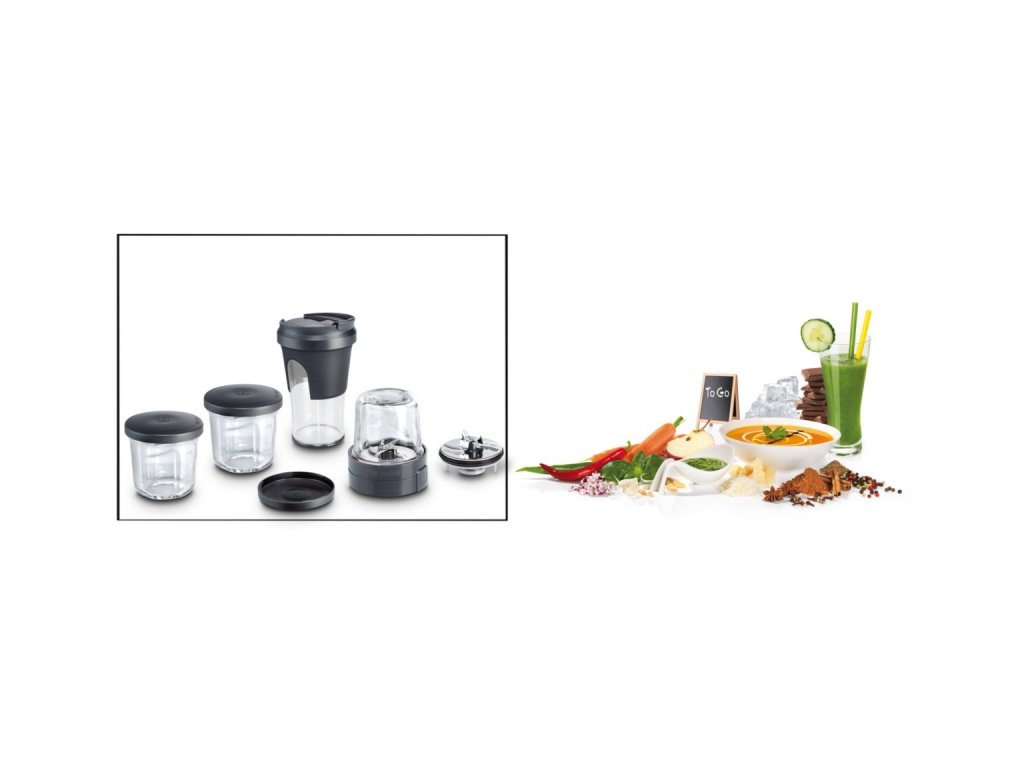 - Multimlýnková sada příslušenství 5 v 1: mixér, mlýnek, krouhač, skladovací nádoby a ToGo funkce.
