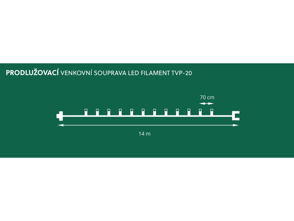 Prodlužovací řetěz pro LED osvětlovací soupravu typ TVP-20, bez napájecího transformátoruŘetěz je určen pro prodloužení základní osvětlovací soupravy s napájecím transformátorem. Celkem je je možné použít až 4 prodlužovací řetězy TVS-20
