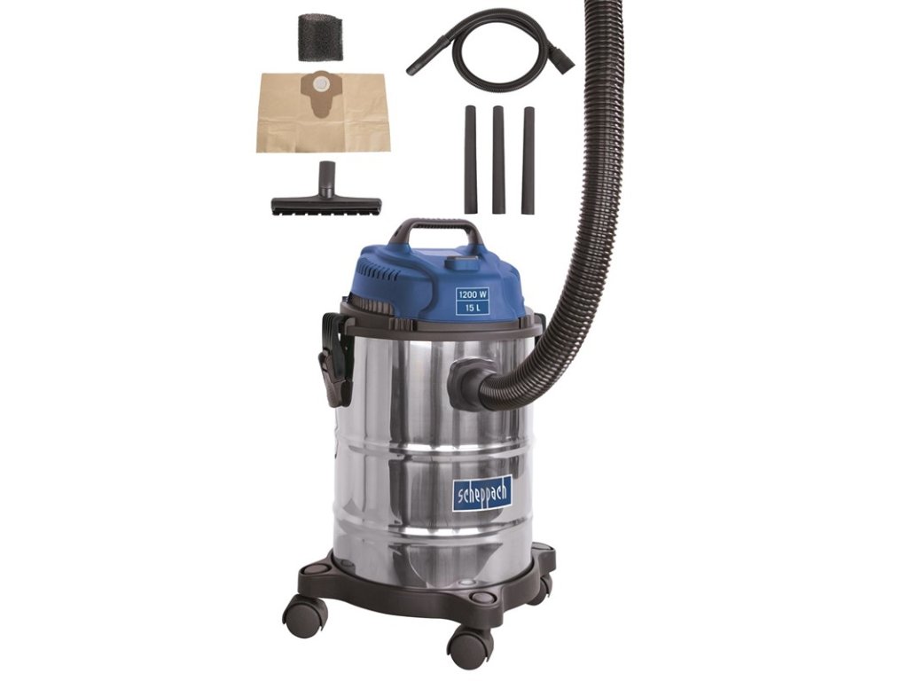 * Scheppach ASP 15-ES je lehký, kompaktní a výkonný vysavač na mokré i suché vysávání s kapacitou zásobníku 15 l. Je velmi dobře vybavený. Má odolné tělo z nerezu, čtyři otočná kolečka a velké madlo pro snadnou manipulaci, integrované držáky na kabel i příslušenství, integrovaný vývod pro funkci foukání, dlouhou hadici o velkém průměru 38 mm a beznástrojový systém pro snadnou a rychlou výměnu filtru. Délka kabelu i hadice zaručuje při práci velký dosah. Celý vysavač je velmi kompaktní a nepotřebuje tak příliš místa na skladování. Vysavač se dodává s bohatým příslušenstvím, nutným jak pro suché, tak i mokré vysávání. V případě potřeby lze vyměnit dodávaný pěnový filtr za ještě účinnější HEPA filtr. Vysavač se skvěle hodí do domácností, dílen, garáží i pro potřeby řemeslníků.