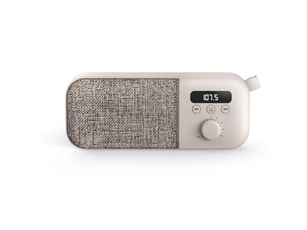 Že zábava a design nejdou dohromady? Tento přenosný přijímač má trendy design s kombinací různých materiálů, zaoblenými křivkami a perfektní cestovní velikost.