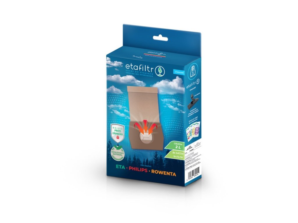 Náhradní sáček do vysavače • vhodné pro vysavače ETA, DeLonghi, Philips, Privileg, Rowenta či Tefal • v balení 5 ks sáčků a 1 filtr • objem 2 l
