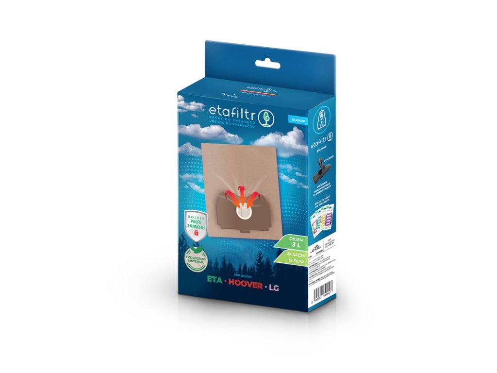 Náhradní sáček do vysavače • vhodné pro vysavače ETA, Hoover, LG • v balení 5 ks sáčků a 1 filtr • objem 3 l