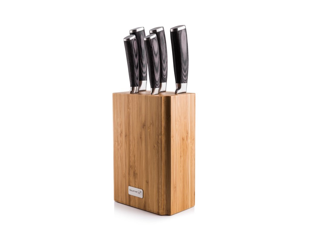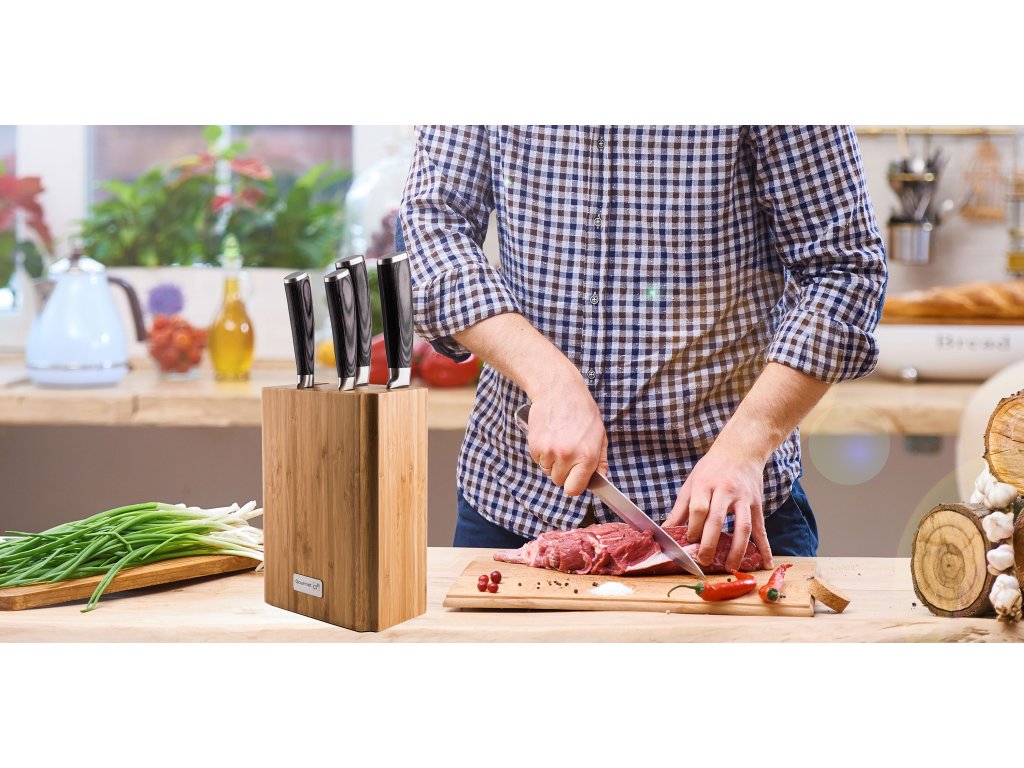 Správná péče o kuchyňské nože prodlouží jejich životnost a ostrost čepelí. Základem správné péče o nože je jejich vhodné ukládání – ideálně do stojanu na nože. Proto k sadě nožů G21 Gourmet Stone dostanete i originální blok na nože z vysoce odolného bambusového dřeva.
