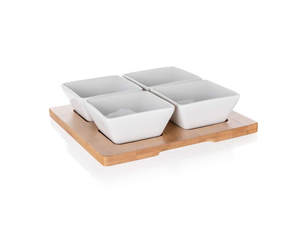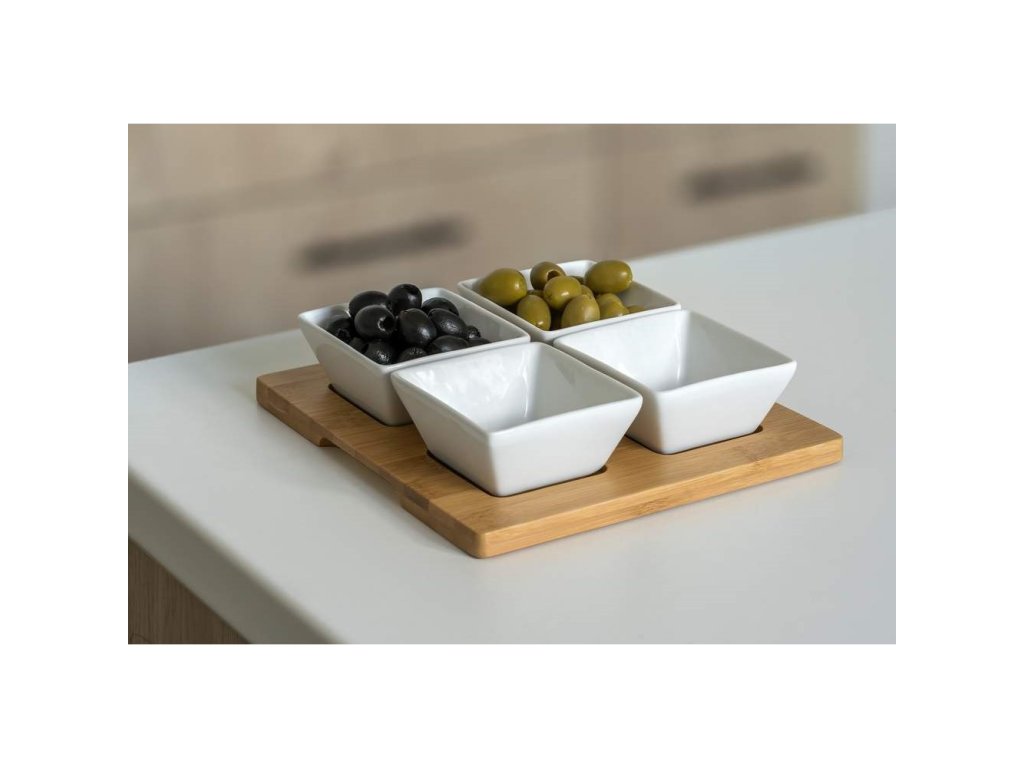 Sada servírovacích keramických misek 5 ks na bambusovém prkénku o rozměru 20 x 20 cm Brillante Bamboo. Je to praktická sada pochutinových misek, ideální pro servírování různých druhů oříšků, sušeného ovoce, oliv apod. Velikost misky je 8 x 8 x 4 cm.Doplňkové parametry